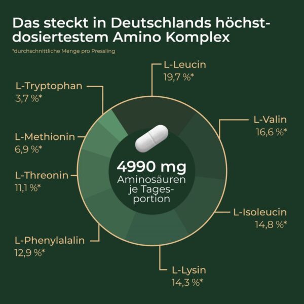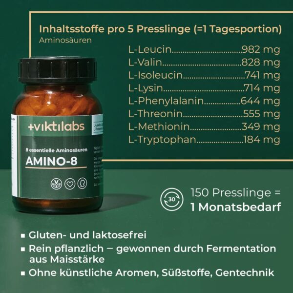 Zutaten: L-Leucin, L-Lysinhydrochlorid, L-Valin, L-Isoleucin, L-Phenylalanin, L-Threonin, L-Methionin, L-Tryptophan