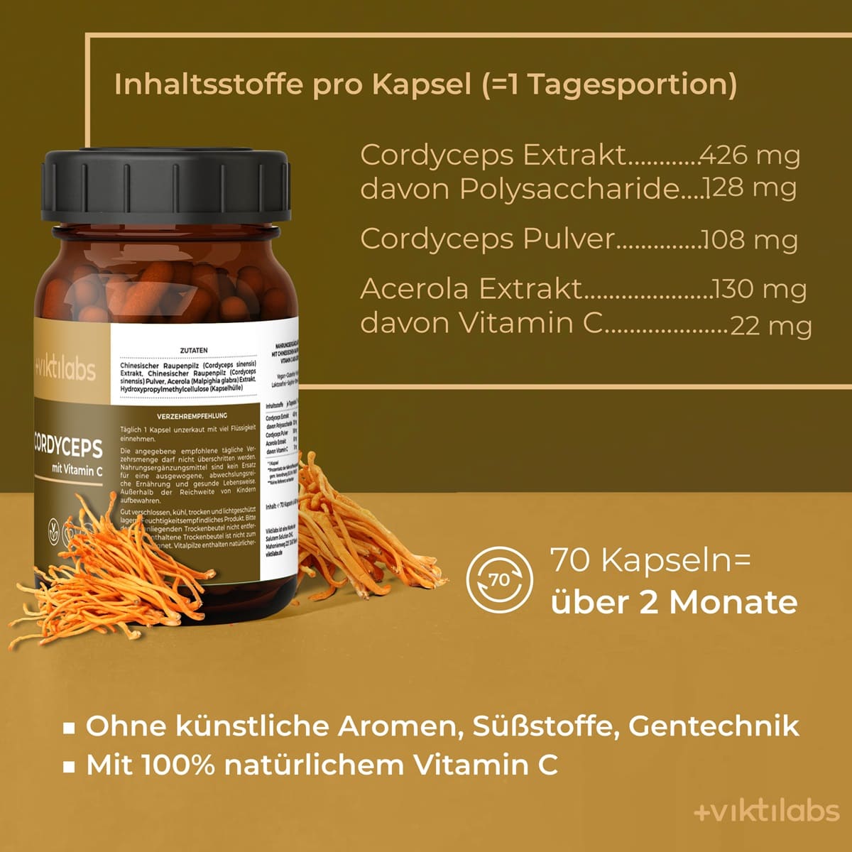 Zutaten: Chinesischer Raupenpilz (Cordyceps sinensis) Extrakt****, Chinesischer Raupenpilz (Cordyceps sinensis) Pulver, Acerola (Malpighia glabra) Extrakt, Hydroxypropylmethylcellulose (Kapselhülle)