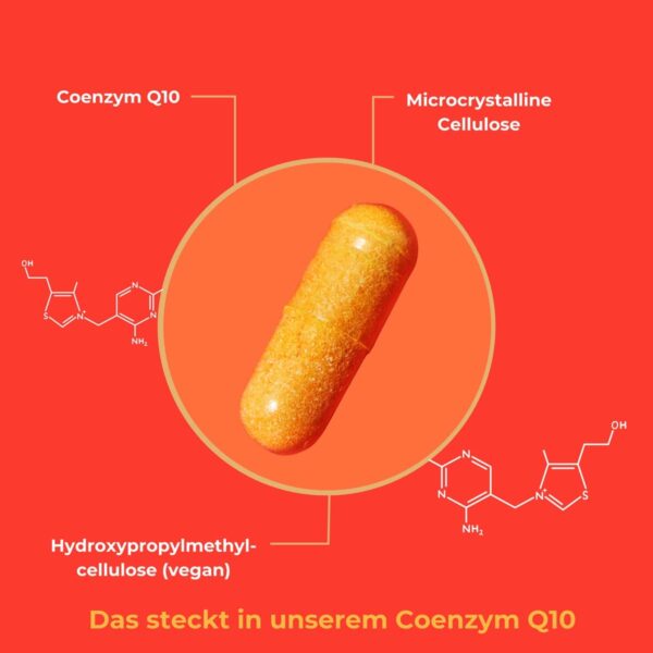 Zutaten: Coenzym Q10, Mikrocrystalline Cellulose (Füllstoff), Kapselhülle: Hydroxypropylmethylcellulose (vegan)