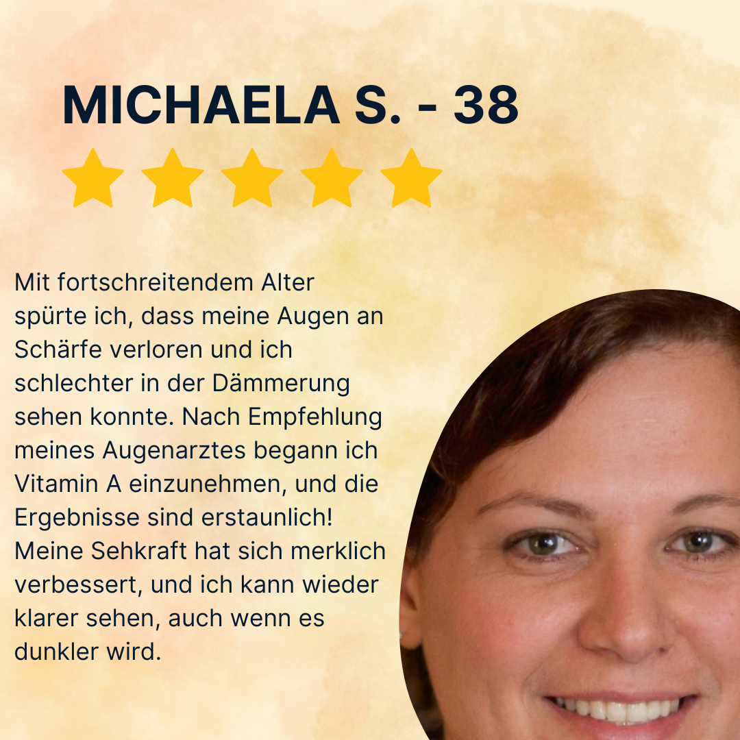 Mit fortschreitendem Alter bemerkte ich, dass meine Augen anfälliger für Trockenheit und Ermüdung wurden. Nachdem ich mit der Einnahme von Vitamin A begonnen habe, spüre ich eine deutliche Verbesserung meiner Augengesundheit. Die lästige Trockenheit ist verschwunden, und ich kann auch länger konzentriert lesen, ohne dass meine Augen ermüden.