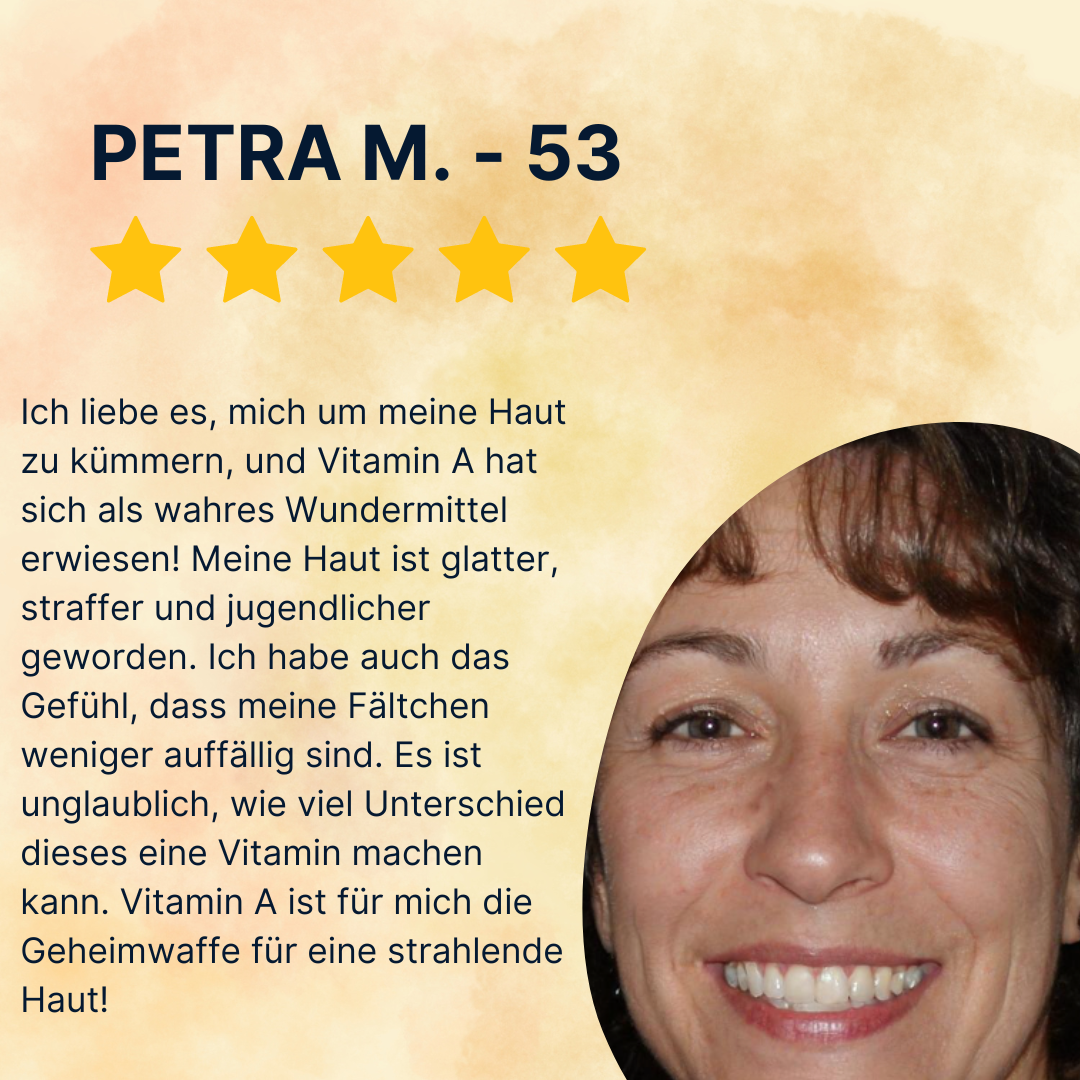 Als Beauty-Enthusiastin bin ich immer auf der Suche nach Produkten, die meiner Haut einen gesunden Glanz verleihen. Vitamin A hat sich als wahres Wundermittel erwiesen! Meine Haut ist klarer und strahlender geworden, und auch feine Linien wirken gemildert. Ich bin begeistert von den Ergebnissen und fühle mich jetzt noch selbstbewusster in meiner Haut.